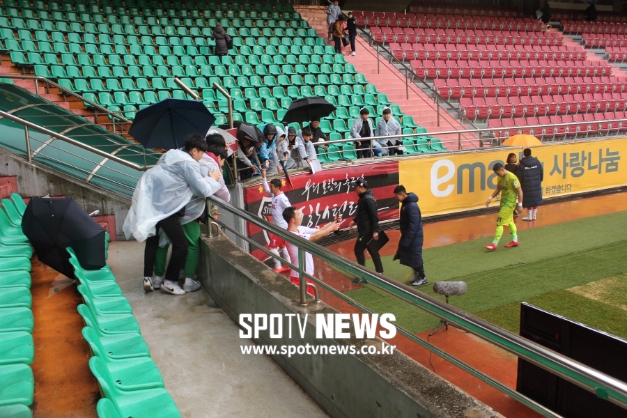 경기를 마치고 보니 스틸야드의 또 하나 장점이 보인다. 바로 코너플래그 쪽에 있는 '선수 출입구'다. 워낙 관중석이 가까워 팬들이 선수들을 코앞에서 볼 수 있다. 선수들에게 하이파이브나 사인을 요청할 수 있는 '틈새' 팬서비스 포인트다. 승리에 기분이 좋았는지 '상병' 김민우가 팬들과 하이파이브하며 드레싱룸으로 들어간다. 셀카 촬영 요청도 당연히 'OK'다.