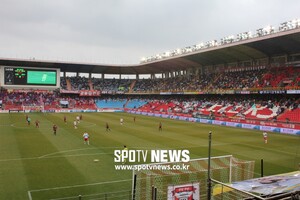송시우의 기가 막힌 헤딩골을 궤적을 손에 잡을 수 있을 듯 가까이서 봤다. 후반 34분께 윤빛가람의 슛을 걷어내는 말도 안되는 강현무의 선방도 불과 5,6미터 앞에서 봤다. 윤빛가람의 슛이 얼마나 강한지, 강현무가 얼마나 멋지게 몸을 날렸는지는 골대 뒤에선 생생하게 느낄 수 있다.