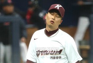 [스포티비뉴스=고척, 곽혜미 기자] 2019 KBO 리그 시범 경기 키움 히어로즈와 롯데 자이언츠의 경기가 15일 오후 서울 구로구 고척스카이돔에서 열렸다. 5회초 실점 위기를 넘긴 키움 김성민이 이닝 종료 후 안도의 표정을 짓고 있다.