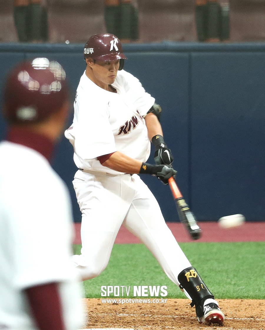[스포티비뉴스=고척, 곽혜미 기자] 2019 KBO 리그 시범 경기 키움 히어로즈와 롯데 자이언츠의 경기가 15일 오후 서울 구로구 고척스카이돔에서 열렸다. 5회말 무사 2루 상황에서 대타로 나온 키움 허정협이 1타점 적시타를 치고 있다.