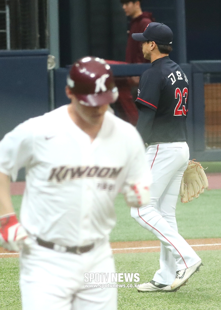 [스포티비뉴스=고척, 곽혜미 기자] 2019 KBO 리그 시범 경기 키움 히어로즈와 롯데 자이언츠의 경기가 15일 오후 서울 구로구 고척스카이돔에서 열렸다. 5회말 2사 3루 키움 샌즈의 타석 때 롯데 고효준이 폭투로 실점을 하고 있다.