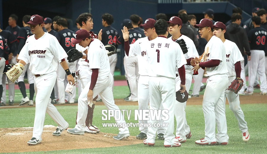 [스포티비뉴스=고척, 곽혜미 기자] 2019 KBO 리그 시범 경기 키움 히어로즈와 롯데 자이언츠의 경기가 15일 오후 서울 구로구 고척스카이돔에서 열렸다. 4-3으로 승리한 키움 선수들이 승리의 하이파이브를 하고 있다.