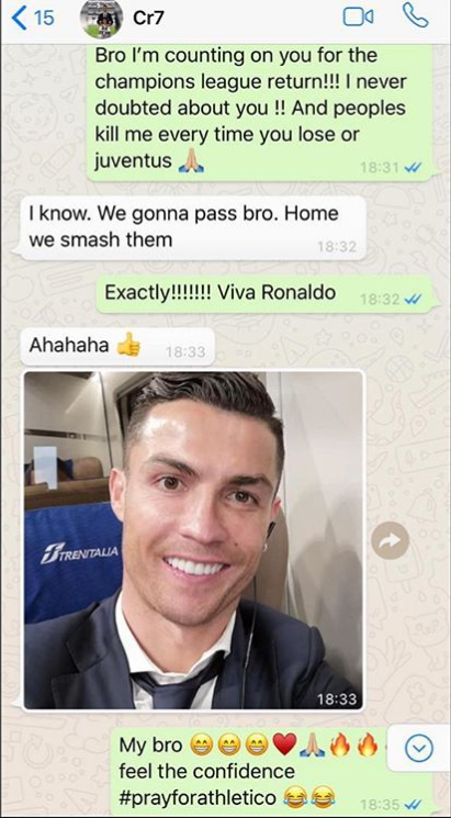 경기 전부터 자신감이 가득 찼다. 과거 맨체스터 유나이티드에서 한솥밥을 먹었던 파트리스 에브라는 14일 SNS에 사진을 공개했다. 호날두와 주고받은 문자 메시지였다.