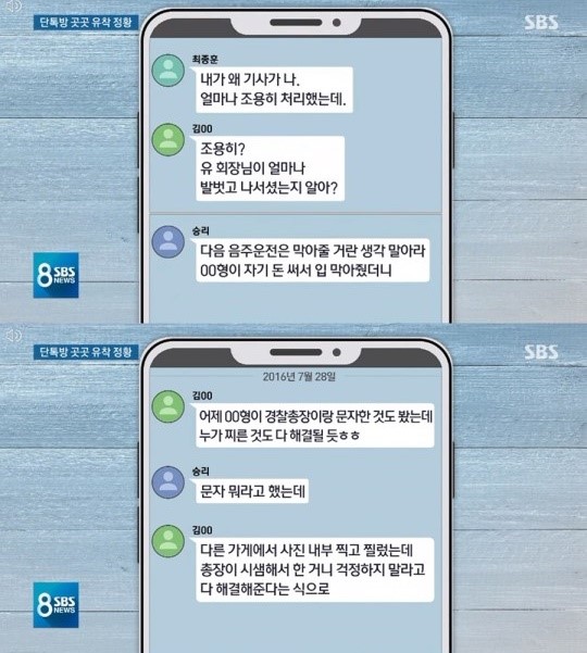 13일 경찰에 따르면 빅뱅 승리, 가수 정준영 등이 참여한 카톡방에서 2016년 한 사람이 "옆 업소가 우리 업소 내부 사진을 찍었는데 '경찰총장'이 걱정 말라더라"는 메시지를 남긴 것으로 확인됐다.