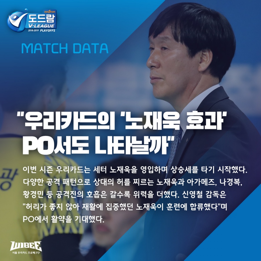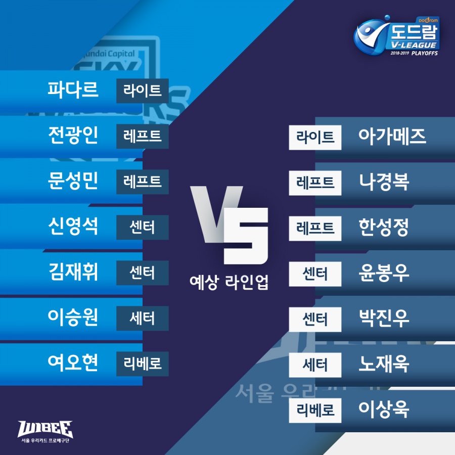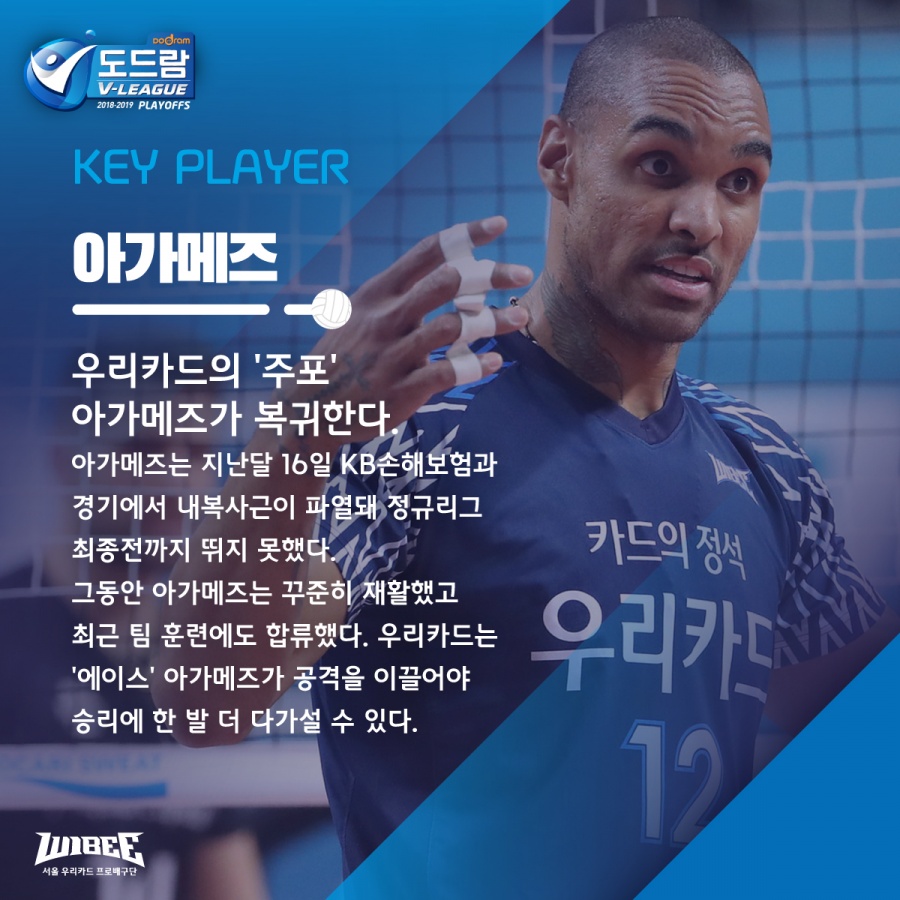 팀 창단 이후 첫 봄 배구에 나서는 우리카드는 부상 회복을 마친 외국인 선수 아가메즈와 주전 세터 노재욱이 출전할 전망입니다.