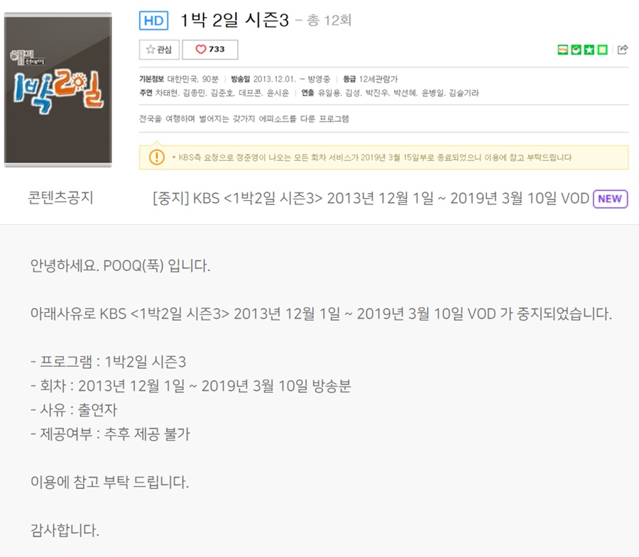 네이버에서는 "KBS측 요청으로 정준영이 나오는 모든 회차 서비스가 2019년 3월 15일부로 종료되었으니 이용에 참고 부탁드립니다"라고 알렸으며, POOQ에서는 "KBS '1박2일 시즌3' 2013년 12월 1일 ~ 2019년 3월 10일 VOD 가 중지되었습니다"라고 밝히며 사유를 '출연자'라고 표기했다. 해당 회차는 추후에도 다시보기 제공이 불가능하다는 점도 명시했다.