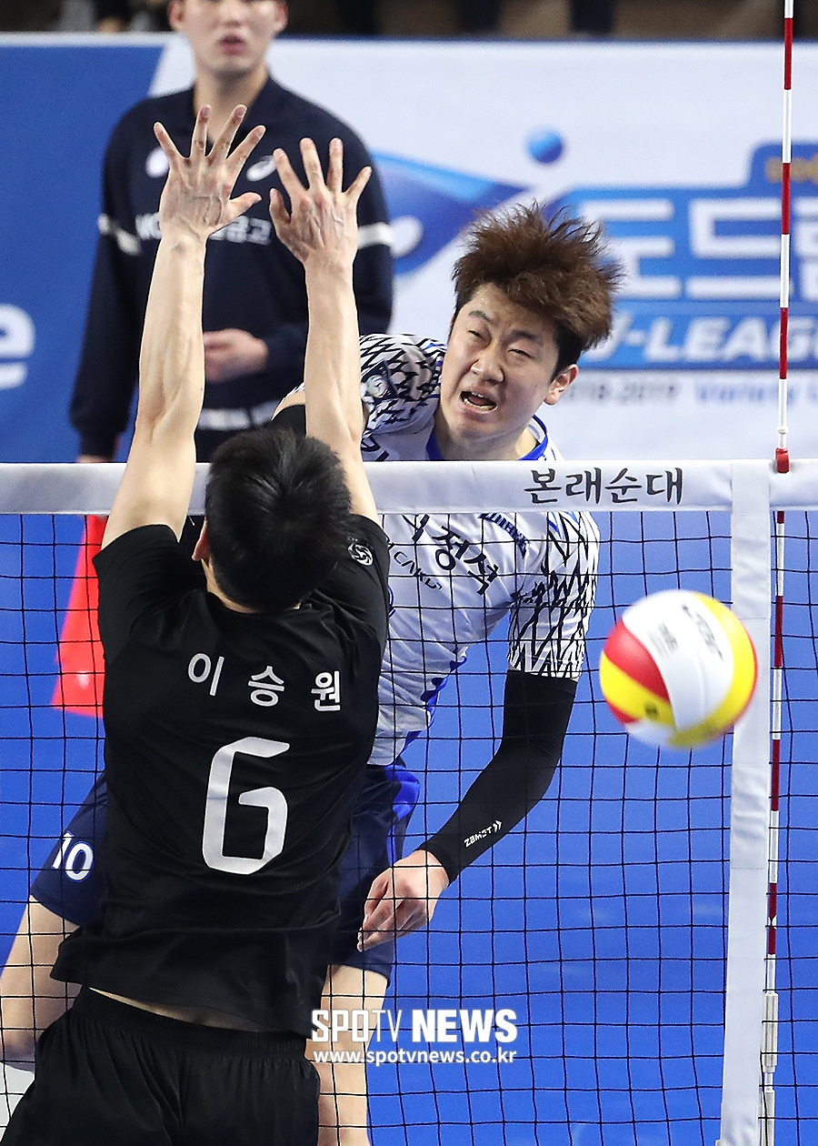 [스포티비뉴스=천안, 곽혜미 기자] 2018-2019 도드람 V리그 남자부 현대캐피탈과 우리카드의 플레이오프 1차전이 16일 오후 충남 천안 유관순체육관에서 열렸다. 우리카드 나경복이 공격을 시도하고 있다.