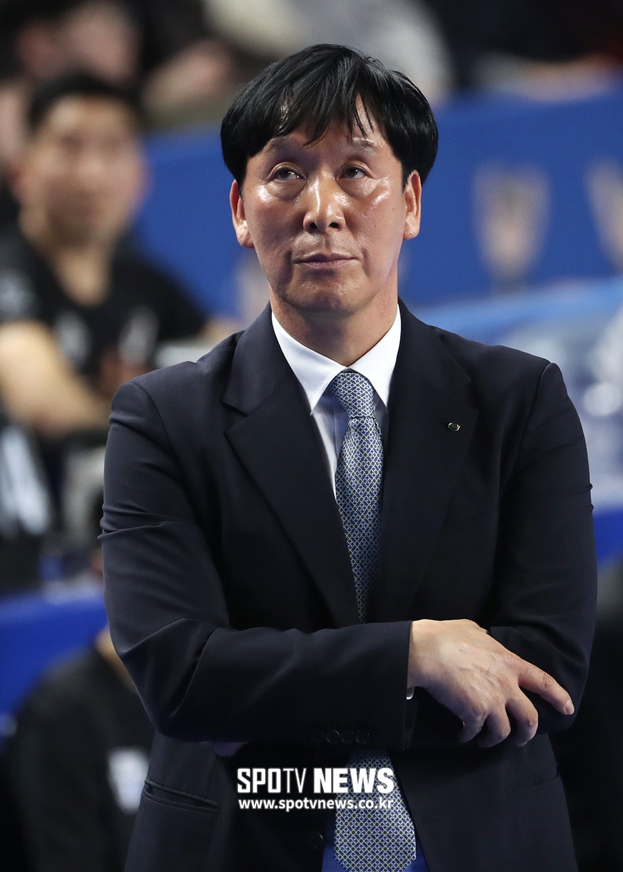 [스포티비뉴스=천안, 곽혜미 기자] 2018-2019 도드람 V리그 남자부 현대캐피탈과 우리카드의 플레이오프 1차전이 16일 오후 충남 천안 유관순체육관에서 열렸다. 우리카드 신영철 감독이 생각에 잠겨있다.