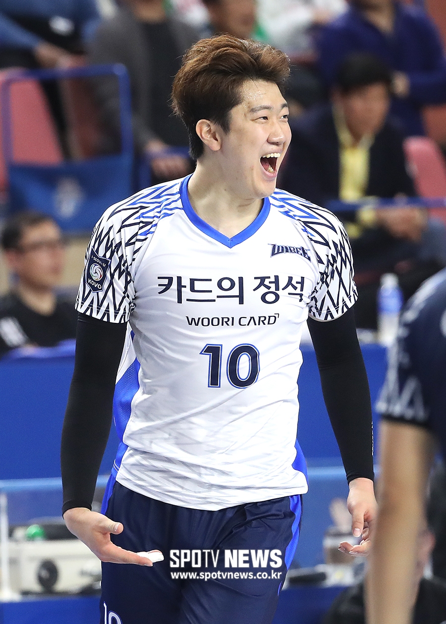 [스포티비뉴스=천안, 곽혜미 기자] 2018-2019 도드람 V리그 남자부 현대캐피탈과 우리카드의 플레이오프 1차전이 16일 오후 충남 천안 유관순체육관에서 열렸다. 우리카드 나경복이 득점에 기뻐하고 있다.