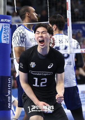 [스포티비뉴스=천안, 곽혜미 기자] 2018-2019 도드람 V리그 남자부 현대캐피탈과 우리카드의 플레이오프 1차전이 16일 오후 충남 천안 유관순체육관에서 열렸다. 득점에 성공한 현대캐피탈 전광인이 포효하고 있다.