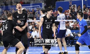 [스포티비뉴스=천안, 곽혜미 기자] 2018-2019 도드람 V리그 남자부 현대캐피탈과 우리카드의 플레이오프 1차전이 16일 오후 충남 천안 유관순체육관에서 열렸다. 득점에 성공한 현대캐피탈 선수들이 포효하고 있다.