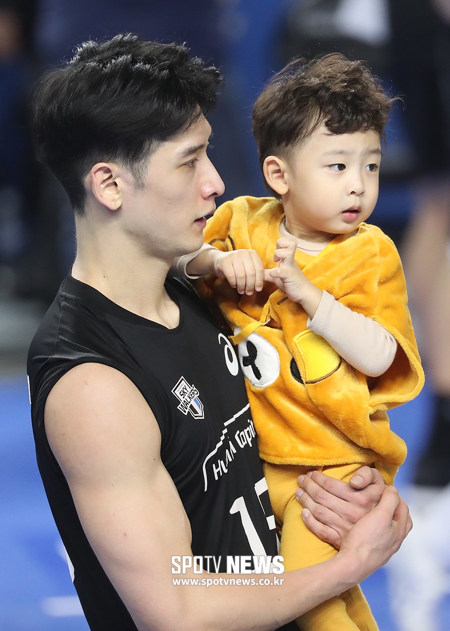[스포티비뉴스=천안, 곽혜미 기자] 2018-2019 도드람 V리그 남자부 현대캐피탈과 우리카드의 플레이오프 1차전이 16일 오후 충남 천안 유관순체육관에서 열렸다. 5세트 접전 끝에 승리를 거둔 현대캐피탈 문성민이 아들 문시호와 기쁨을 나누고 있다.