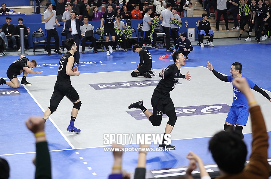 [스포티비뉴스=천안, 곽혜미 기자] 2018-2019 도드람 V리그 남자부 현대캐피탈과 우리카드의 플레이오프 1차전이 16일 오후 충남 천안 유관순체육관에서 열렸다. 5세트 접전 끝에 승리를 거둔 현대캐피탈 선수들이 포효하고 있다.