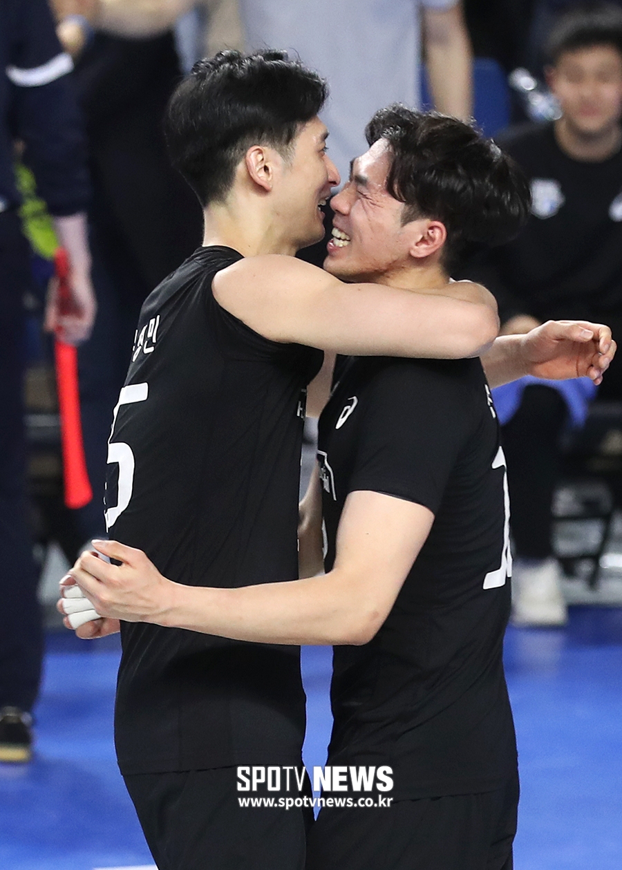 [스포티비뉴스=천안, 곽혜미 기자] 2018-2019 도드람 V리그 남자부 현대캐피탈과 우리카드의 플레이오프 1차전이 16일 오후 충남 천안 유관순체육관에서 열렸다. 5세트 접전 끝에 승리를 거둔 현대캐피탈 문성민과 전광인이 포옹을 하고 있다.