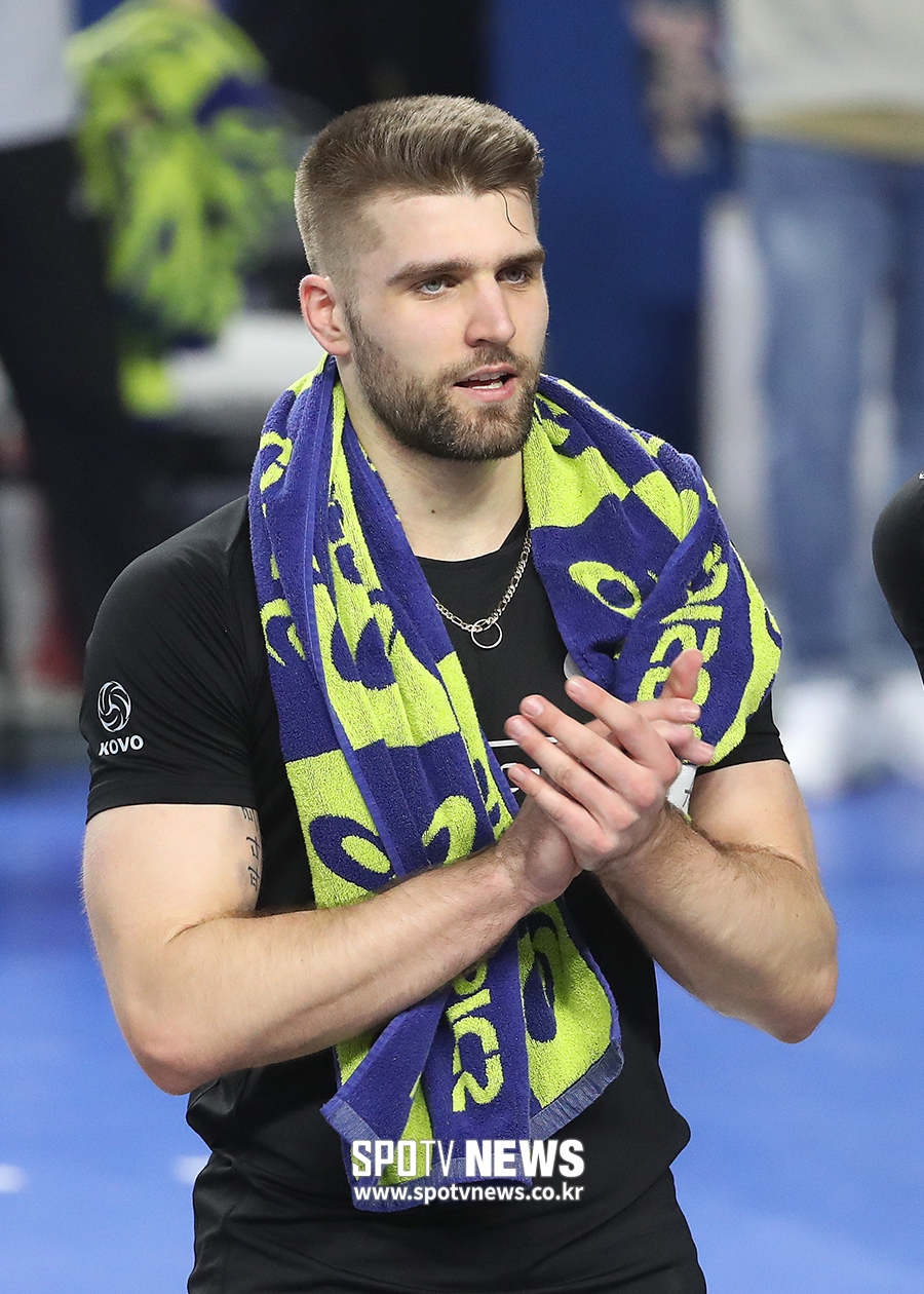 [스포티비뉴스=천안, 곽혜미 기자] 2018-2019 도드람 V리그 남자부 현대캐피탈과 우리카드의 플레이오프 1차전이 16일 오후 충남 천안 유관순체육관에서 열렸다. 5세트 접전 끝에 승리를 거둔 파다르가 미소를 짓고 있다.