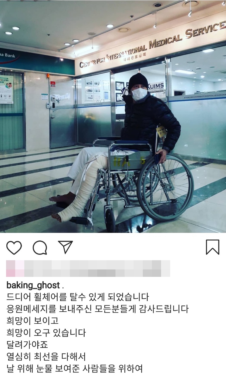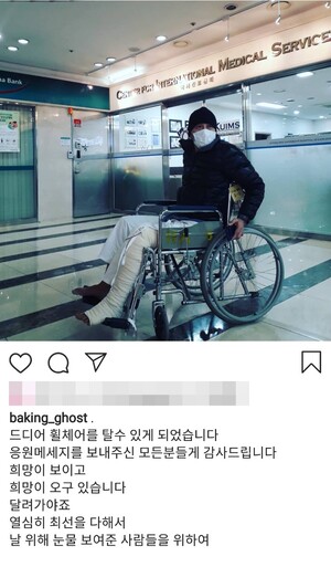 김영호는 17일 자신의 인스타그램에 휠체어를 타고 있는 사진을 게재했다. 사진 속 김영호는 마스크를 쓰고 다리 깁스를 한 채 휠체어를 몰고 있다.