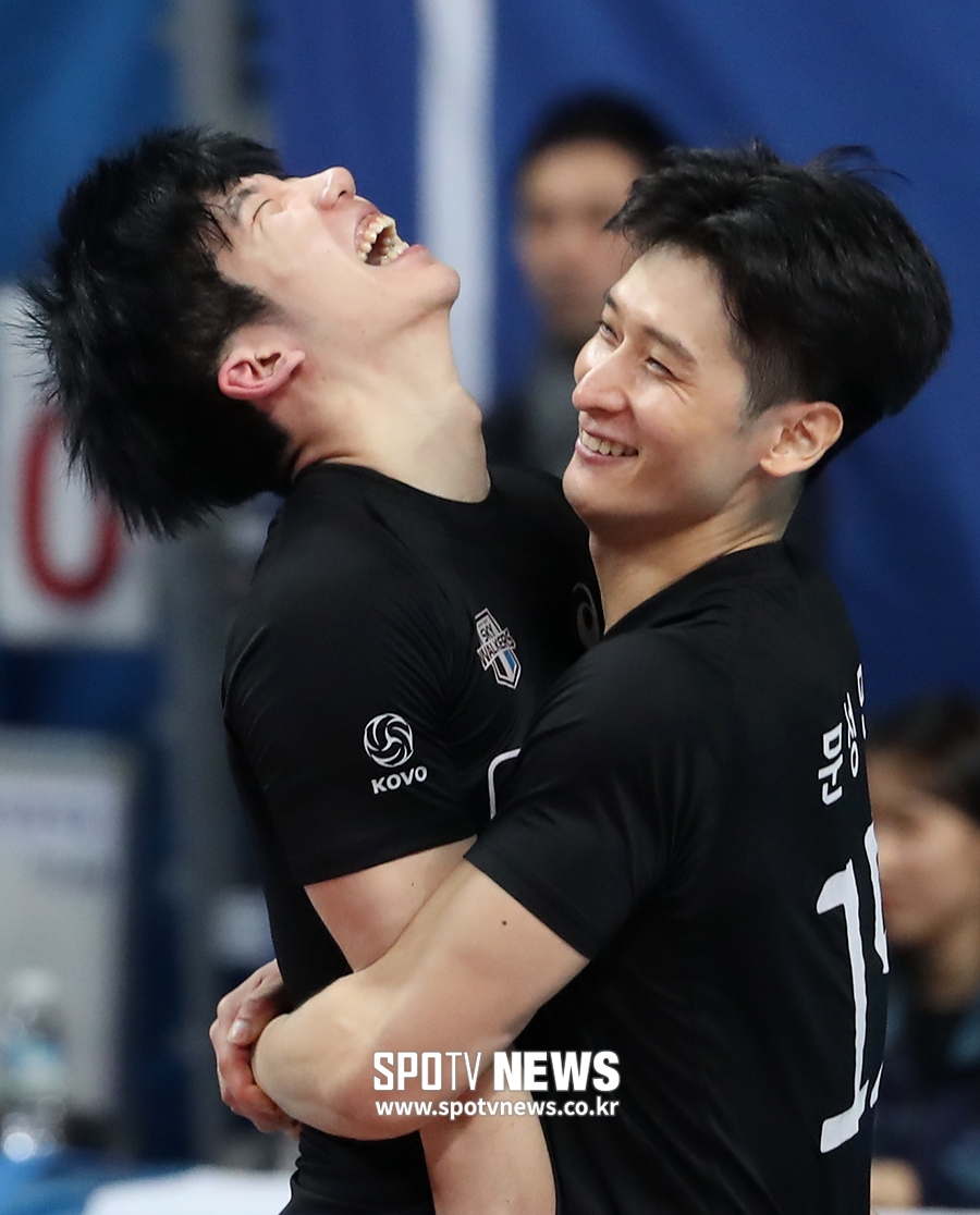 [스포티비뉴스=서울, 한희재 기자] 우리카드와 현대캐피탈의 2018-2019 도드람 V리그 플레이오프 2차전이 18일 오후 서울 중구 장충체육관에서 열렸다. 현대캐피탈 문성민이 연속 서브 득점을 올린 허수봉을 얼싸안고 있다.