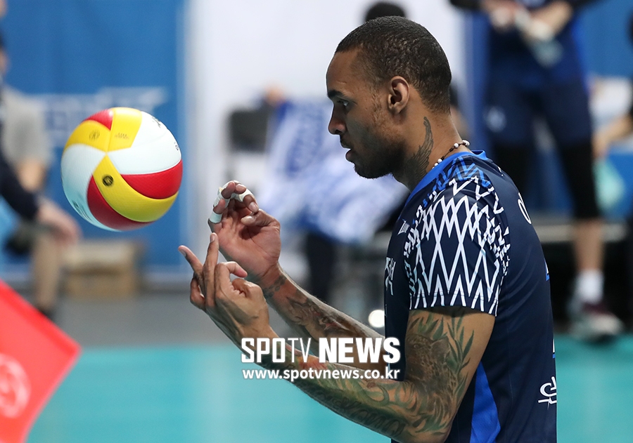 [스포티비뉴스=서울, 한희재 기자] 우리카드와 현대캐피탈의 2018-2019 도드람 V리그 플레이오프 2차전이 18일 오후 서울 중구 장충체육관에서 열렸다. 우리카드 아가메즈가 서브를 준비하고 있다.