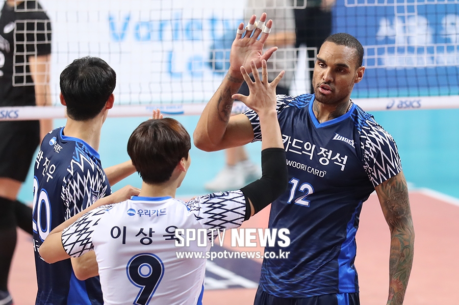 [스포티비뉴스=서울, 한희재 기자] 우리카드와 현대캐피탈의 2018-2019 도드람 V리그 플레이오프 2차전이 18일 오후 서울 중구 장충체육관에서 열렸다. 득점을 올린 우리카드 아가메즈가 하이파이브를 하고 있다.