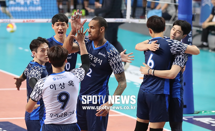 [스포티비뉴스=서울, 한희재 기자] 우리카드와 현대캐피탈의 2018-2019 도드람 V리그 플레이오프 2차전이 18일 오후 서울 중구 장충체육관에서 열렸다. 득점을 올린 우리카드 선수들이 서로를 격려하고 있다.