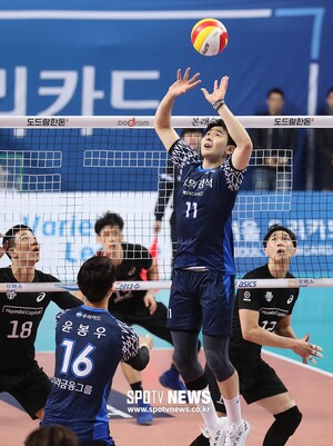[스포티비뉴스=서울, 한희재 기자] 우리카드와 현대캐피탈의 2018-2019 도드람 V리그 플레이오프 2차전이 18일 오후 서울 중구 장충체육관에서 열렸다. 득점을 올린 우리카드 선수들이 환호하고 있다.