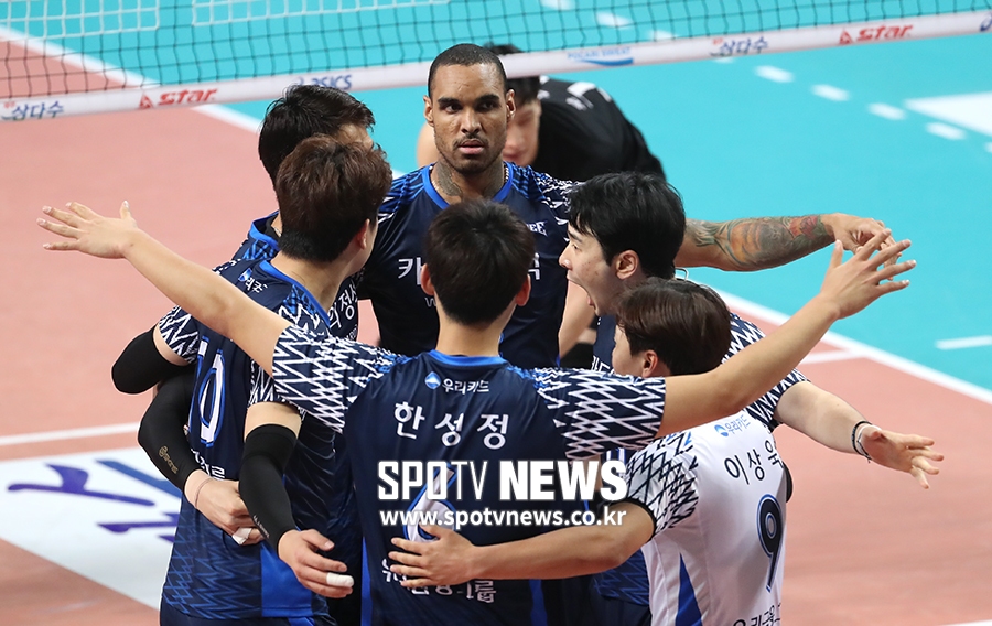 [스포티비뉴스=서울, 한희재 기자] 우리카드와 현대캐피탈의 2018-2019 도드람 V리그 플레이오프 2차전이 18일 오후 서울 중구 장충체육관에서 열렸다. 득점을 올린 우리카드 아가메즈가 동료들의 환호를 받고 있다.