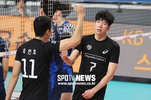 [스포티비뉴스=서울, 한희재 기자] 우리카드와 현대캐피탈의 2018-2019 도드람 V리그 플레이오프 2차전이 18일 오후 서울 중구 장충체육관에서 열렸다. 득점을 올린 현대캐피탈 허수봉이 기뻐하고 있다.