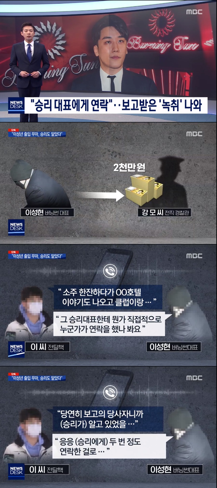 19일 MBC '뉴스데스크'는 2017년 '버닝썬'이 미성년자 출입 신고를 받고 영업 정지 위기였을 때 경찰에게 뒷돈을 주고 이를 무마하려는 내용을 승리가 알고 있었다고 보도했다.
