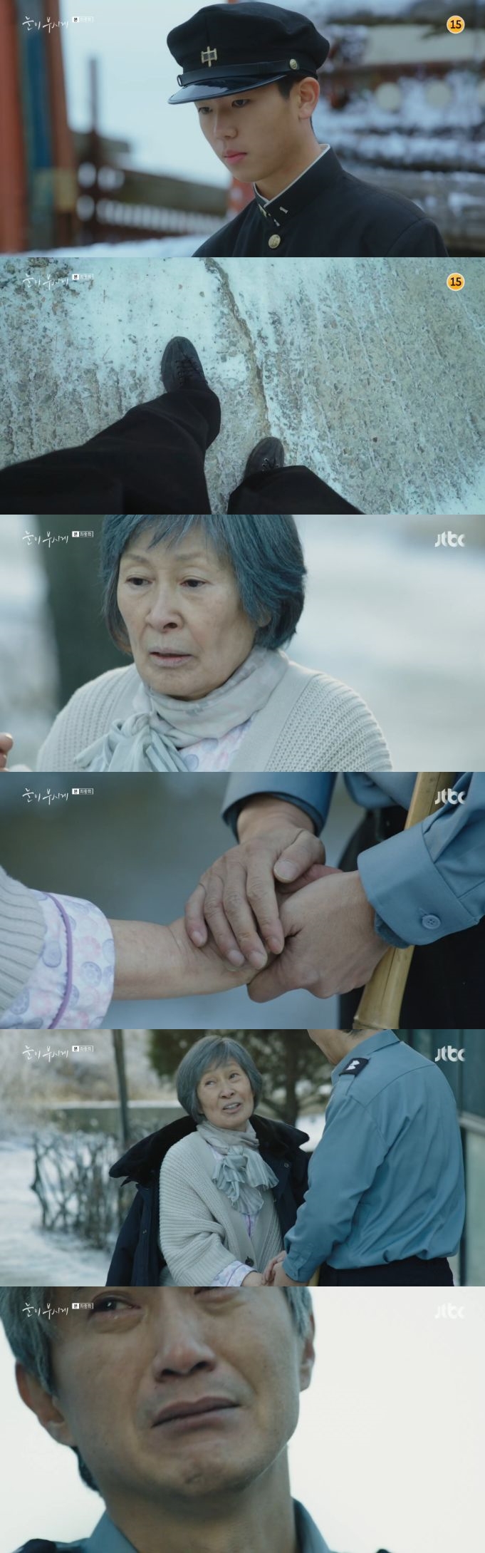 현재의 대상은 눈이 오는 날, 눈을 쓸어가며 과거를 떠올렸다. 한쪽 다리가 의족이였던 그는 눈이 오는 아침에 등교할 때마다 누군가가 쓸어 놓은 집앞 가파른 길을 안전하게 내려올 수 있었다. 그 순간 요양원에서는 어머니의 실종 전화가 걸려왔다. 한참을 어머니를 찾아 헤맨 그는 힘없는 모습으로 빗자루를 들고 바닥의 눈을 쓸고 있는 어머니를 마주했다. 혜자는 대상을 알아보지 못하고 "눈이 오면, 우리 아들이 넘어져요. 눈을 쓸어야해요"라고 말했다. 대상은 그런 어머니 앞에서 오열하며 "그 아들, 한번도 넘어진 적이 없대요"라고 말했다.
