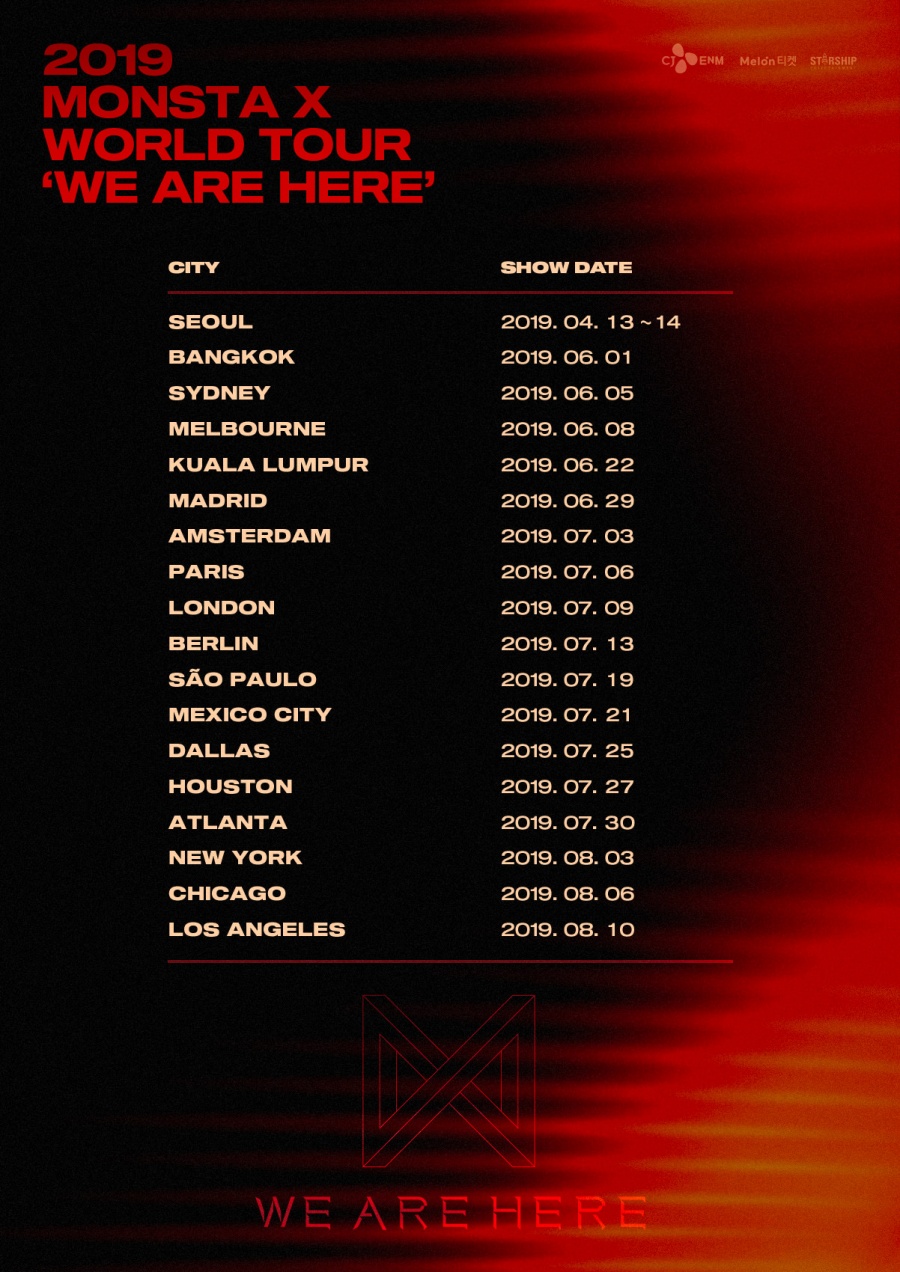 몬스타엑스는 오는 4월 13일, 14일 서울 올림픽공원 SK올림픽 핸드볼경기장에서 2019 월드투어의 첫 콘서트를 개최한다. 몬스타엑스는 서울을 시작으로 아시아, 유럽, 북미, 남미 등 세계 여러 도시를 누빈다.