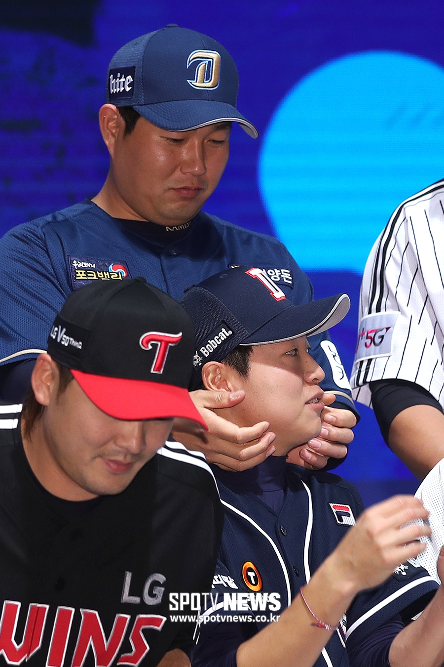 [스포티비뉴스=서울, 곽혜미 기자] 2019 신한은행 MY CAR KBO 미디어 데이&팬페스트 행사가 21일 오후 서울 강남구 삼성동 코엑스 오디토리움에서 열렸다. NC 양의지가 두산 정수빈의 볼을 어루만지고 있다.