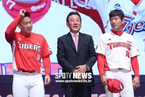 [스포티비뉴스=서울, 곽혜미 기자] 2019 신한은행 MY CAR KBO 미디어 데이&팬페스트 행사가 21일 오후 서울 강남구 삼성동 코엑스 오디토리움에서 열렸다. KIA 안치홍, 김기태, 김주찬(왼쪽부터)이 포즈를 취하고 있다.