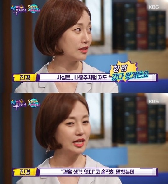 특히 진경이 이혼 사실을 밝혀 눈길을 끌었다. 그는 "한 번 다녀왔다"며 "KBS2 '넝쿨째 굴러온 당신'이 끝나고 첫 인터뷰를 했다. 기자님의 '결혼 생각 없으세요?'라는 질문에 '결혼 생각 없습니다'라고 대답했는데 '싱글'로 기사가 나가버렸다. 시간이 지나니 내가 미혼으로 굳어져 있었다"며 이혼 경력을 밝혔다.