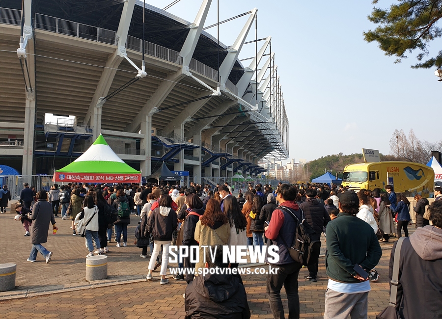 울산의 날씨는 따뜻했다. 그 탓인지 경기장에는 일찌감치 축구 팬들로 가득했다. 울산문수경기장 앞에 마련된 대한축구협회 공식 MD 상품 판매처에는 관련 상품을 구입하기 위해 기다리는 팬들의 줄이 길었다. 이 판매처에는 플래너, 에코백, 핀 배지, 응원봉, 손흥민 무릎 담요 등 다양한 제품을 판매했다.