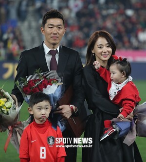 [스포티비뉴스=울산, 한희재 기자] 대한민국 축구대표팀과 볼리비아 대표팀의 평가전이 22일 오후 울산문수축구경기장에서 열렸다. 하프타임때 국가대표 은퇴식을 한 김정우가 가족과 기념촬영을 하고 있다.