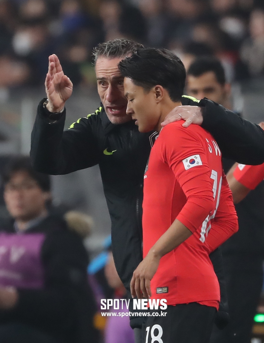 [스포티비뉴스=울산, 한희재 기자] 대한민국 축구대표팀과 볼리비아 대표팀의 평가전이 22일 오후 울산문수축구경기장에서 열렸다. 벤투 감독이 후반 교체 투입되는 이승우에게 작전을 지시하고 있다.