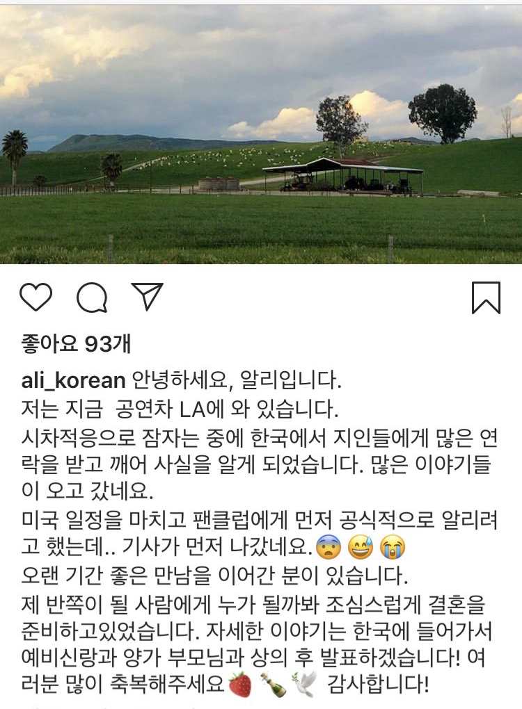 그러나 지인들의 연락을 받고 소식을 확인한 알리가 인스타그램에 직접 결혼 사실을 인정하면서 마음을 놓은 팬들의 축하를 받을 수 있게 됐다.