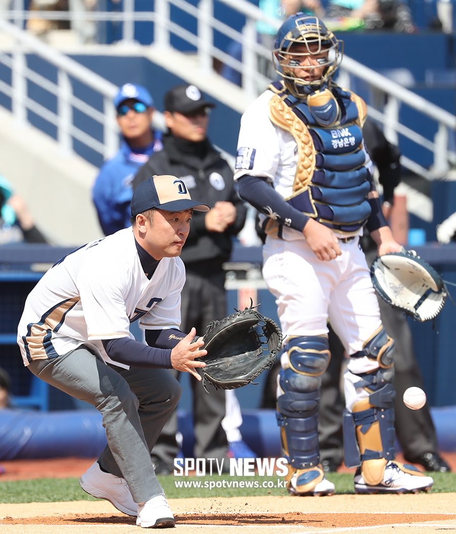 [스포티비뉴스=창원, 한희재 기자] NC 다이노스와 삼성 라이온즈의 2019 신한은행 MY CAR KBO리그 개막전이 23일 오후 창원NC파크에서 열렸다. NC 포수 양의지가 수비를 위해 자리로 돌아가고 있다.