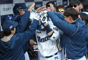 [스포티비뉴스=창원, 한희재 기자] NC 다이노스와 삼성 라이온즈의 2019 신한은행 MY CAR KBO리그 개막전이 23일 오후 창원NC파크에서 열렸다. 1회말 1사, NC 양의지가 이적 후 첫 타석에서 홈런을 친 후 동료들의 축하를 받고 있다.