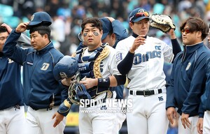 [스포티비뉴스=창원, 한희재 기자] NC 다이노스와 삼성 라이온즈의 2019 신한은행 MY CAR KBO리그 개막전이 23일 오후 창원NC파크에서 열렸다. 7-0으로 승리한 NC 양의지가 팬들에게 인사하고 있다.