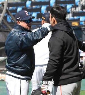 [스포티비뉴스=잠실, 곽혜미 기자] 2019 신한은행 MY CAR KBO리그 두산 베어스와 한화 이글스의 경기가 24일 오후 서울 잠실야구장에서 열린다. 두산 김태형 감독과 한화 하주석이 인사를 나누고 있다.