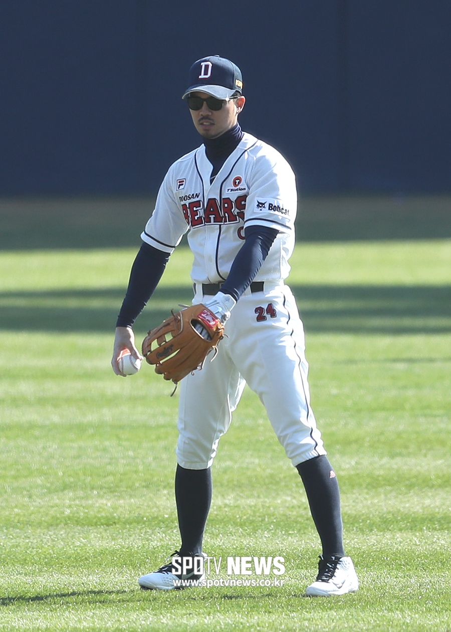 [스포티비뉴스=잠실, 곽혜미 기자] 2019 신한은행 MY CAR KBO리그 두산 베어스와 한화 이글스의 경기가 24일 오후 서울 잠실야구장에서 열렸다. 7회초 선두타자 김태균의 타구를 더듬거리다 놓친 두산 2루수 오재원이 아쉬워하고 있다.