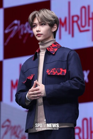 [스포티비뉴스=서울, 곽혜미 기자] 보이그룹 스트레이키즈 미니 앨범 '클레 원 : 미로(Cle 1 : MIROH)' 발매 기념 쇼케이스가 25일 오후 서울 광진구 광장동 예스24라이브홀에서 열렸다. 스트레이키즈 필릭스가 포즈를 취하고 있다.