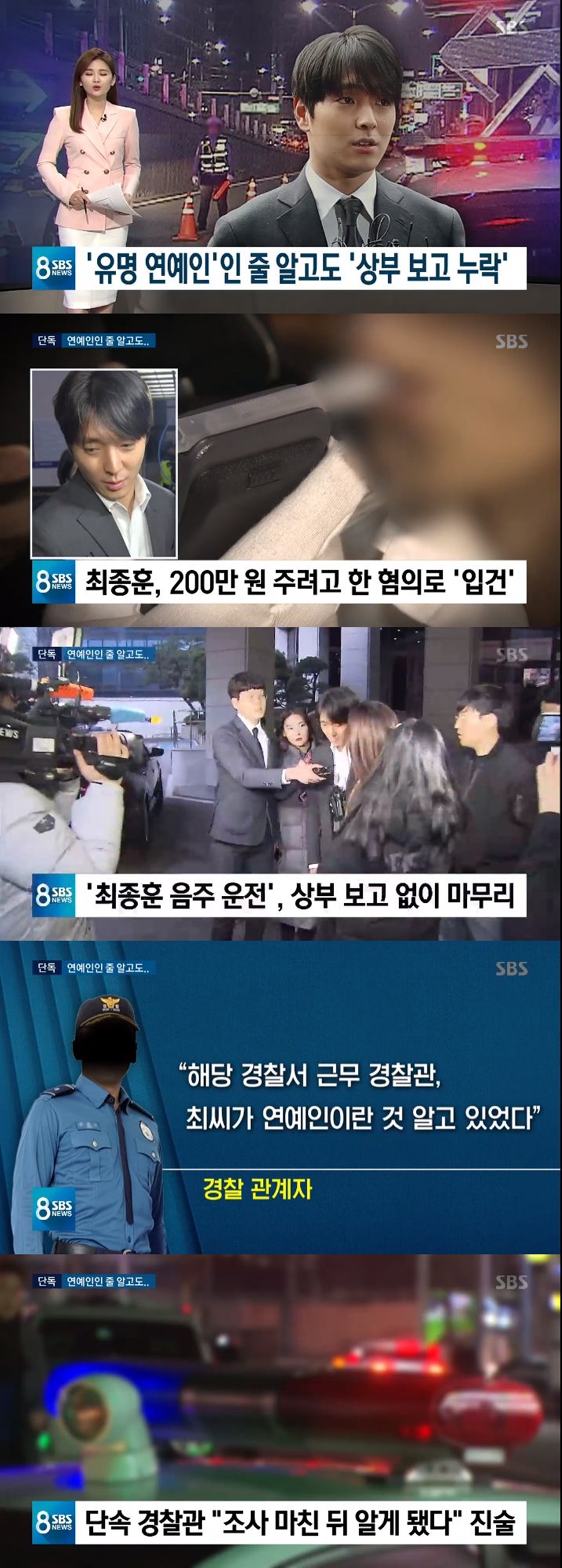 25일 방송된 SBS '8뉴스'는 3년 전 가수 최종훈이 음주운전에 적발됐을 때 경찰이 그를 알고서도 보고를 누락했다고 보도했다.