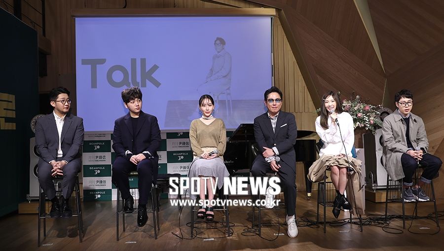 [스포티비뉴스=서울, 곽혜미 기자] '월간윤종신X빈폴' 뮤직 프로젝트 '이제 서른' 제작 발표회가 26일 오전 서울 용산구 이태원 스트라디움에서 열렸다. 어반자카파, 윤종신, 태연, 장범준이 기자 간담 시간을 갖고 있다.