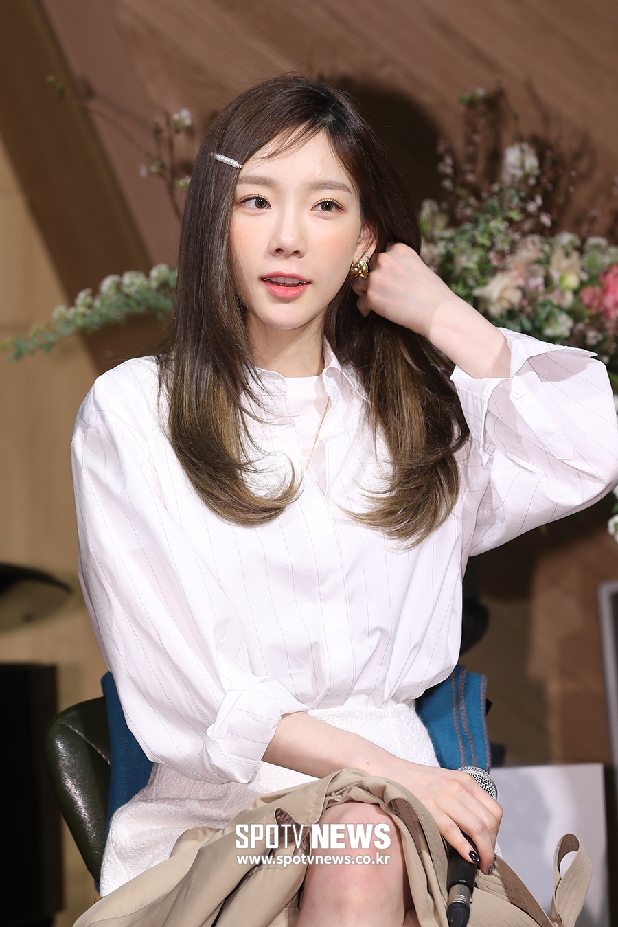 [스포티비뉴스=서울, 곽혜미 기자] '월간윤종신X빈폴' 뮤직 프로젝트 '이제 서른' 제작 발표회가 26일 오전 서울 용산구 이태원 스트라디움에서 열렸다. 가수 태연이 머리를 넘기고 있다.
