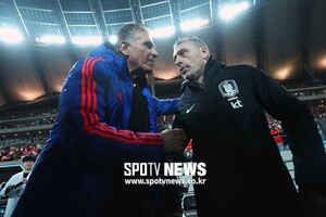 [스포티비뉴스=서울, 곽혜미 기자] 대한민국 축구대표팀과 콜롬비아 대표팀의 평가전이 26일 오후 서울월드컵경기장에서 열렸다. 콜롬비아 케이로스 감독과 한국 벤투 감독이 인사를 나누고 있다.