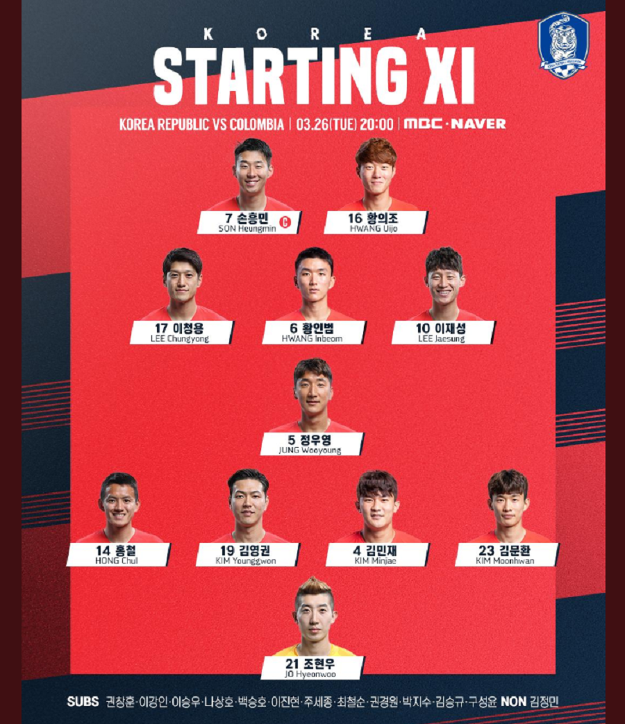 ◆선발명단:흥민-의조 투톱, 강인-승우 벤치…콜롬비아, 하메스-팔카오 벤치