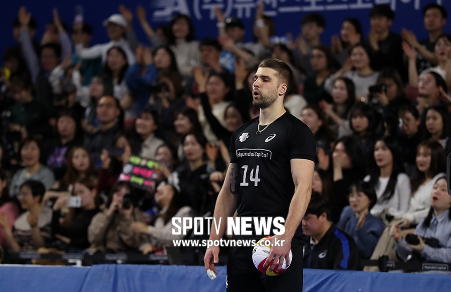 [스포티비뉴스=천안, 한희재 기자] 현대캐피탈과 대한항공의 2018-2019 도드람 V리그 챔피언 결정전 3차전이 26일 오후 충남 천안 유관순체육관에서 열렸다. 서브를 준비하는 현대캐피탈 파다르가 숨을 고르고 있다.