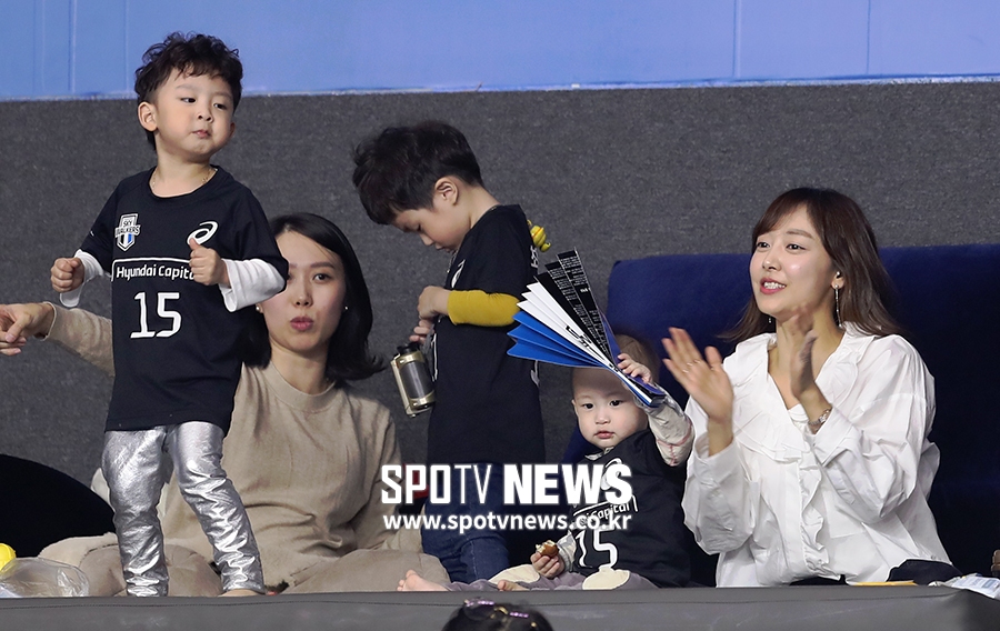 [스포티비뉴스=천안, 한희재 기자] 현대캐피탈과 대한항공의 2018-2019 도드람 V리그 챔피언 결정전 3차전이 26일 오후 충남 천안 유관순체육관에서 열렸다. 현대캐피탈 문성민의 아내 박진아씨가 아들들과 응원을 하고 있다.